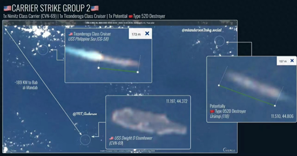 从卫星图片看,当时美国海军的“艾森豪威尔”号航母正在距离曼德海峡约190公里的位置上进行巡航,而其护航舰船提康德罗加级巡洋舰“菲律宾海”号则位于航母的西北方向。在“艾森豪威尔”号东北方向约60公里的位置上,一艘长度超过157米的未知军舰正和美军舰队同向航行。
