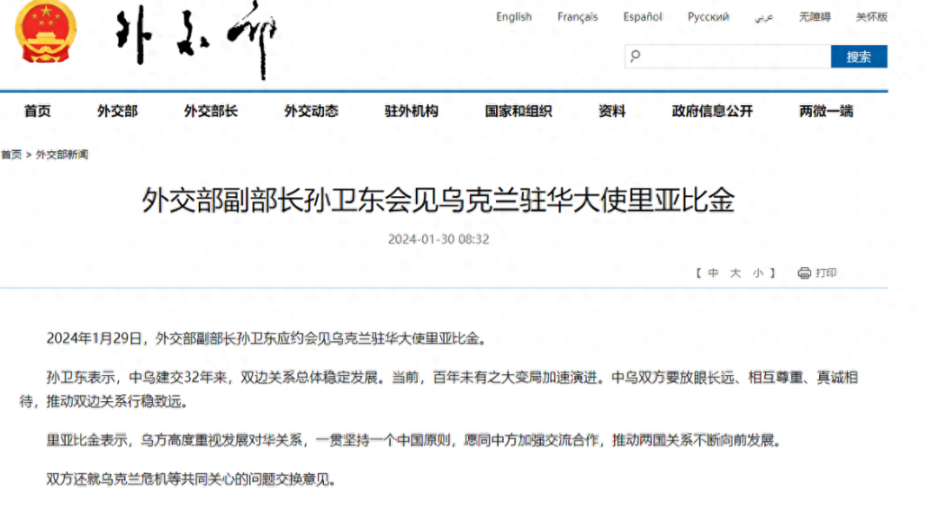 据外交部网站消息,1月29日,乌克兰驻华大使里亚比金主动上门求见,中方外交部副部长孙卫东出面接待。而里亚比金见到我副外长后第一句话就是,乌克兰高度重视发展对华关系,一直坚持一个中国原则,愿意加强与中国的交流合作,推动两国关系不断向前发展。