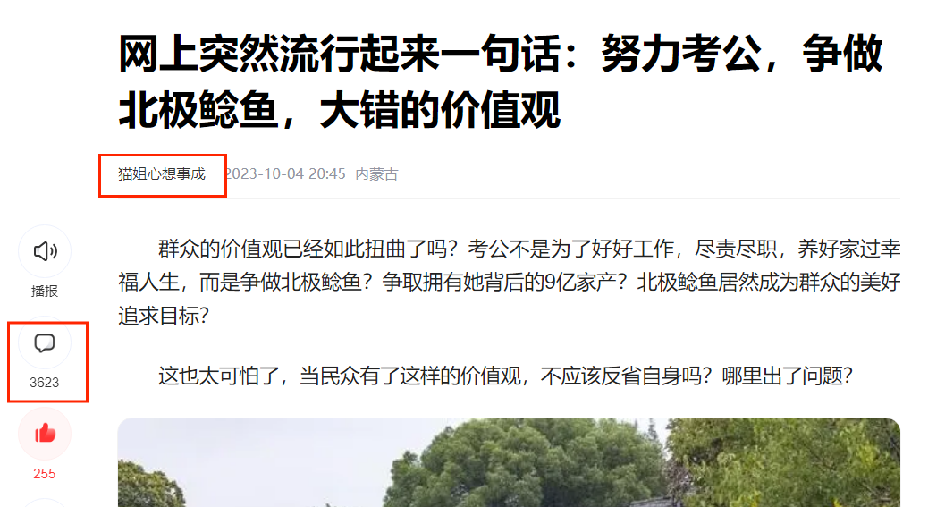 群众的价值观已经如此扭曲了吗?考公不是为了好好工作,尽责尽职,养好家过幸福人生,而是争做北极鲶鱼?争取拥有她背后的9亿家产?北极鲶鱼居然成为群众的美好追求目标?