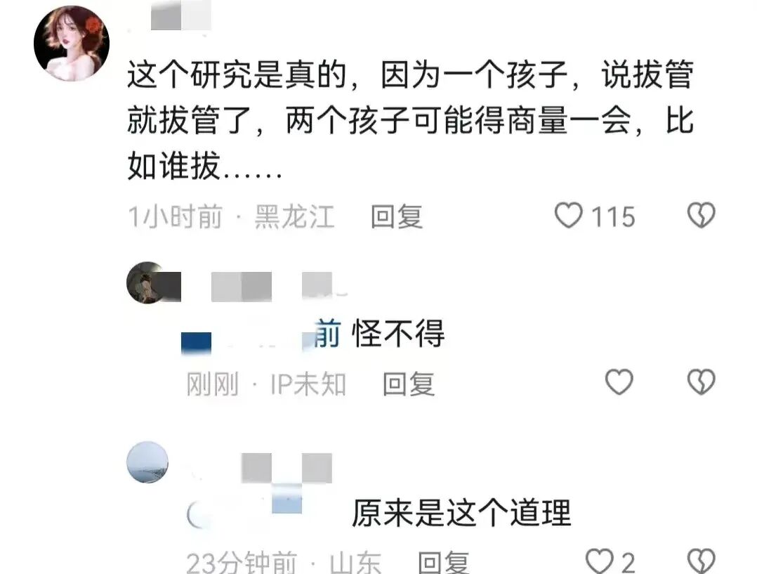 不过,正如网友所言,一个孩子说拔管就拔管,两个孩子就得商量一会儿了,比如谁去拔管,这一来一去,可不寿命长了嘛。