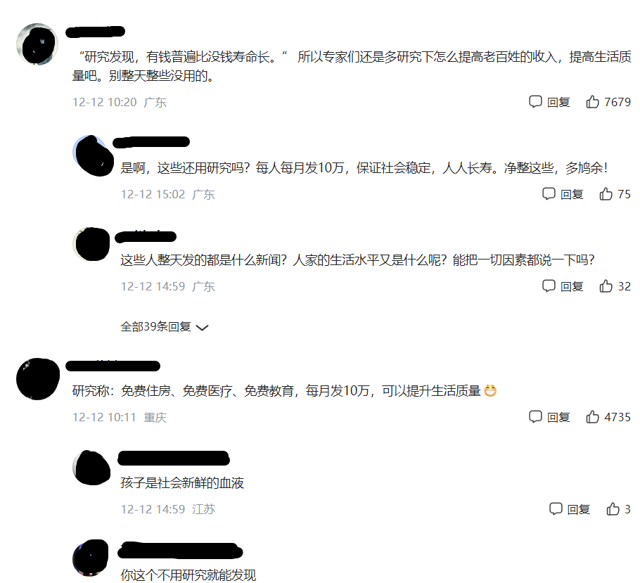 各地网友纷纷发来“新研究结果”:有钱普遍比没钱寿命长。