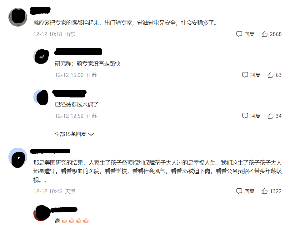 这位网友更是直白,他说:就应该把专家的嘴都拴起来,出门骑专家,省油省电又安全,社会安稳多了。