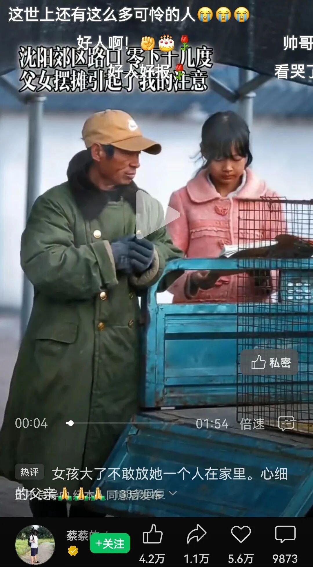 零下十几度的街道边,父亲带着女儿摆摊,女儿衣着显得单薄了,脖子露在外面,并没有围巾保暖,这一幕让很多网友心疼。