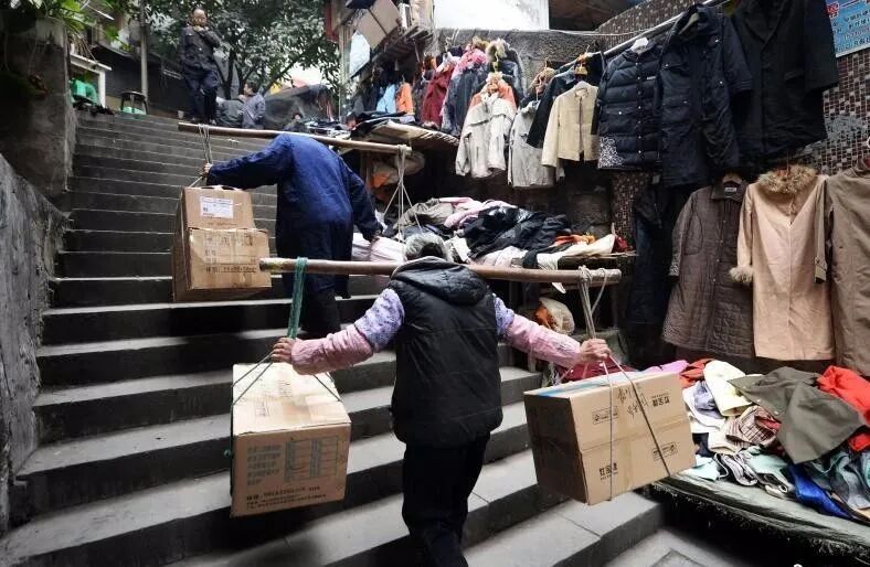 两位老人肩挑货物,正送往商家店中,他们已不再年轻,却还要身受劳苦。