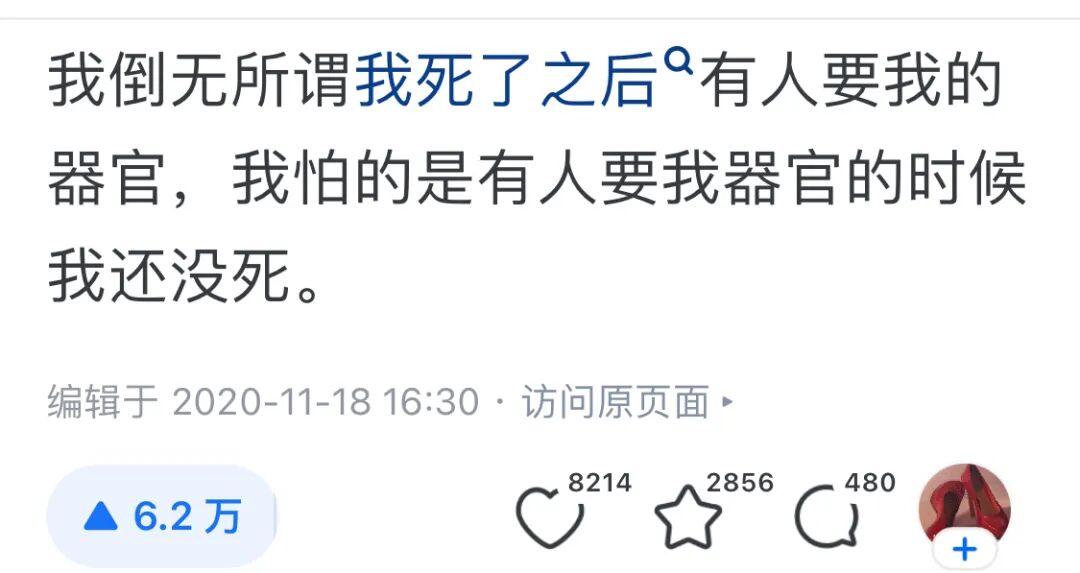 我倒无所谓我死了之后有人要我的器官,我怕的是有人要我器官的时候我还没死。