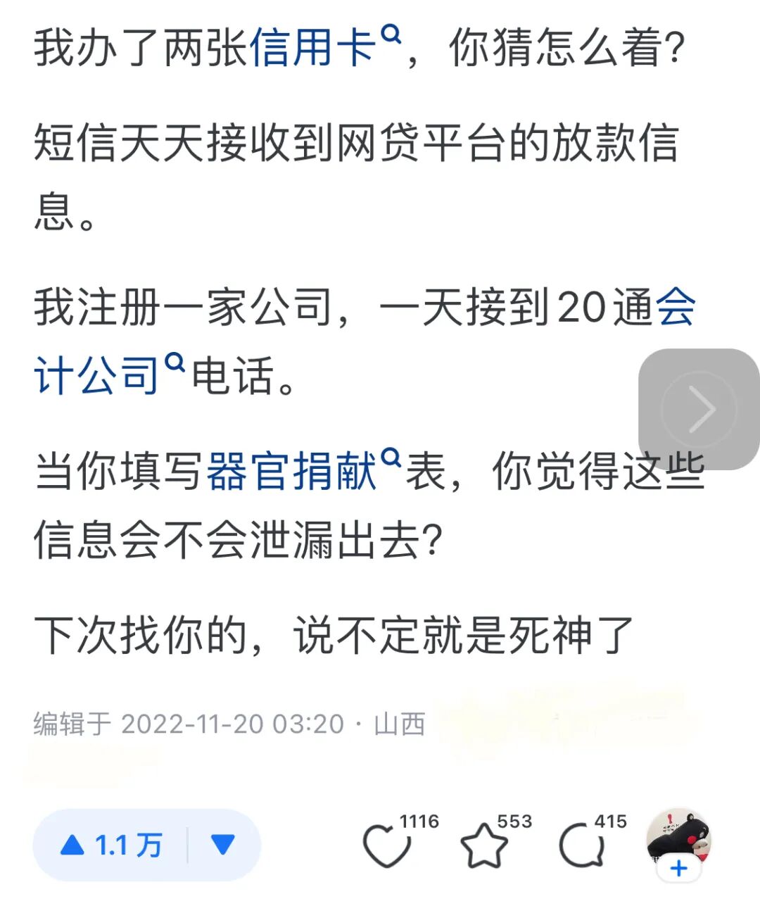 短信天天接收到网贷平台的放款信息。我注册一家公司,一天接到20通会计公司电话,当你填写器官捐献表,你觉得这些信息会不会泄露出去?