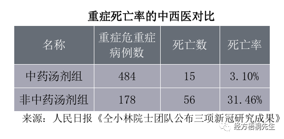 第二,仝小林院士提供的重症死亡率数据,中药汤剂组484例,死亡15例,死亡率3.1%;非中药汤剂组,178例,死亡56例,死亡31.46%。数量级差了十倍。