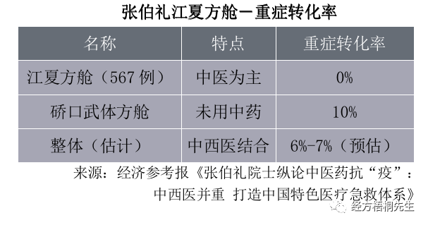 第一,重症转化率,仝小林院士提供的只用中药的430例患者,重症转化率是0%;未用中药的对照组291重症转化率是6.5%。张伯礼院士提供的数据是,以中医为主江夏方舱重症转化率是0%,没用中药的硚口武体方舱重症转化率是10%。另外估计所有的方舱医院重症转化率在6%-7%左右。