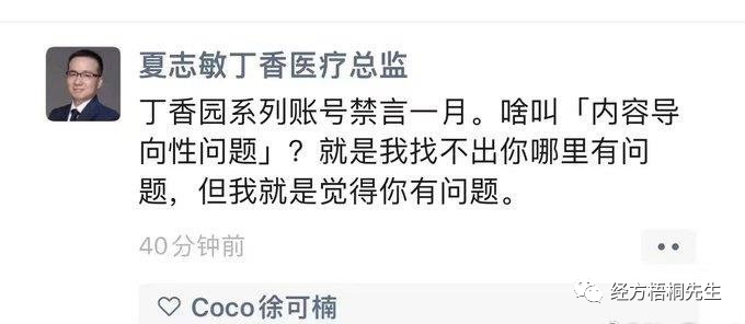 最后,还要注意什么?夏志敏本身是内容总监,负责“建设运营丁香头条等 37 个微信公众号”,出了这么大事,不光丁香医生要对投资者对股东对老板交代,还有你夏志敏也要对公司交代,轻巧一句就把责任和担子扔给了监管方:喏,这是监管的问题,跟我这个总监没关系。