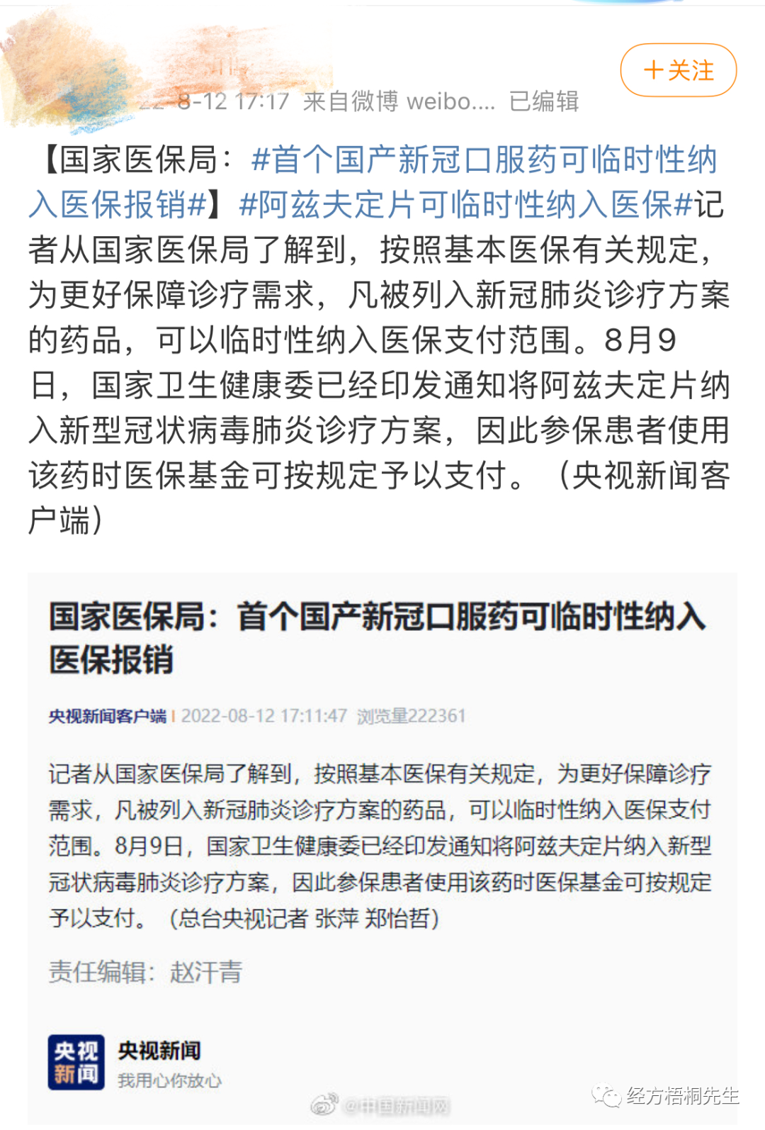 我们看到,国家医保局并没有称之为首个新冠口服药,这个说法从何而来,依据何在?就因为公众喜新厌旧,所以媒体就能够不假思索的人云亦云吗?媒体报道居然是以“【国家医保局:#首个国产新冠口服药可临时性纳入医保报销#】”为标题。