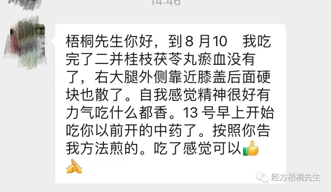 病人女儿告诉我,吃着桂枝茯苓丸,淤血就从大腿往下走到膝盖下,再走到小腿,然后脚后跟,就没有了,没有了。这也是特别的。