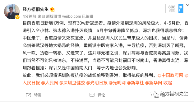 当是时,请务必借鉴武汉等地大锅汤的经验,重新派中医专家入港,主导抗疫。否则深圳灭了新冠,风一吹,货物一转移,又进来了。这并非无稽之谈,深圳病毒与香港病毒高度同源。