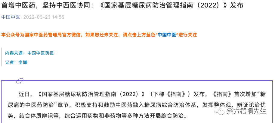 报道说,《指南》是在2018年版指南基础上,结合国内外研究最新进展进行的更新。《指南》明确中医药对防治糖尿病的功效。一是中医药能协同控糖、改善症状。2型糖尿病在常规治疗基础上可辨证联用津力达颗粒、参芪降糖颗粒、天麦消渴片、消渴丸……、葛根芩连汤、大柴胡汤加减等。