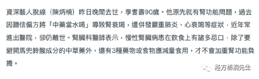 4,回到攻击中药论的人的身上。昨天我看到一条让人哭笑不得的新闻,说艺人脱线90岁去世,因为中药当水喝导致肾衰竭,观感如下: