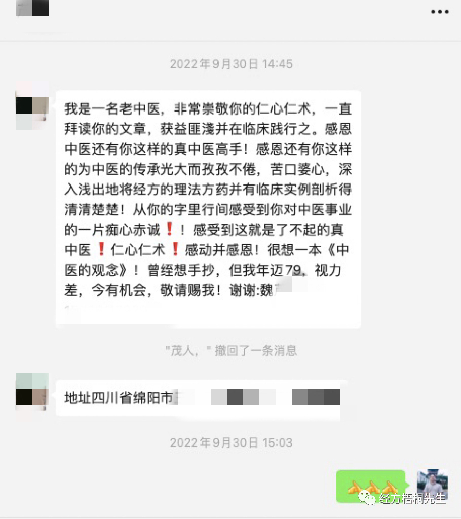 “我是一名老中医,非常崇敬你的仁心仁术,一直拜读你的文章,获益匪淺并在临床践行之。感恩中医还有你这样的真中医高手!感恩还有你这样的为中医的传承光大而孜孜不倦,苦口婆心,深入浅出地将经方的理法方药并有临床实例剖析得清清楚楚!从你的字里行间感受到你对中医事业的一片痴心赤诚!感受到这就是了不起的真中医!仁心仁术!感动并感恩!很想一本《中医的观念》!曾经想手抄,但我年迈79,视力差,今有机会,敬请赐我!”