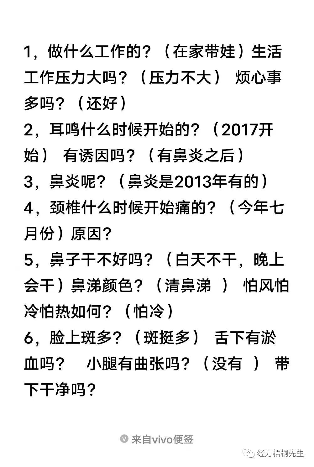 比如这个病人,既有耳鸣、鼻炎又有颈椎病,是不是要分先后?昨天有个朋友跟我讲他太太脸发胀,牙疼,不知道是不是牙疼导致的。其实只要知道发病的先后次序,就已经清楚了。——不一定是因果关系,但是时间间隔短的,一般而言是因果关系。