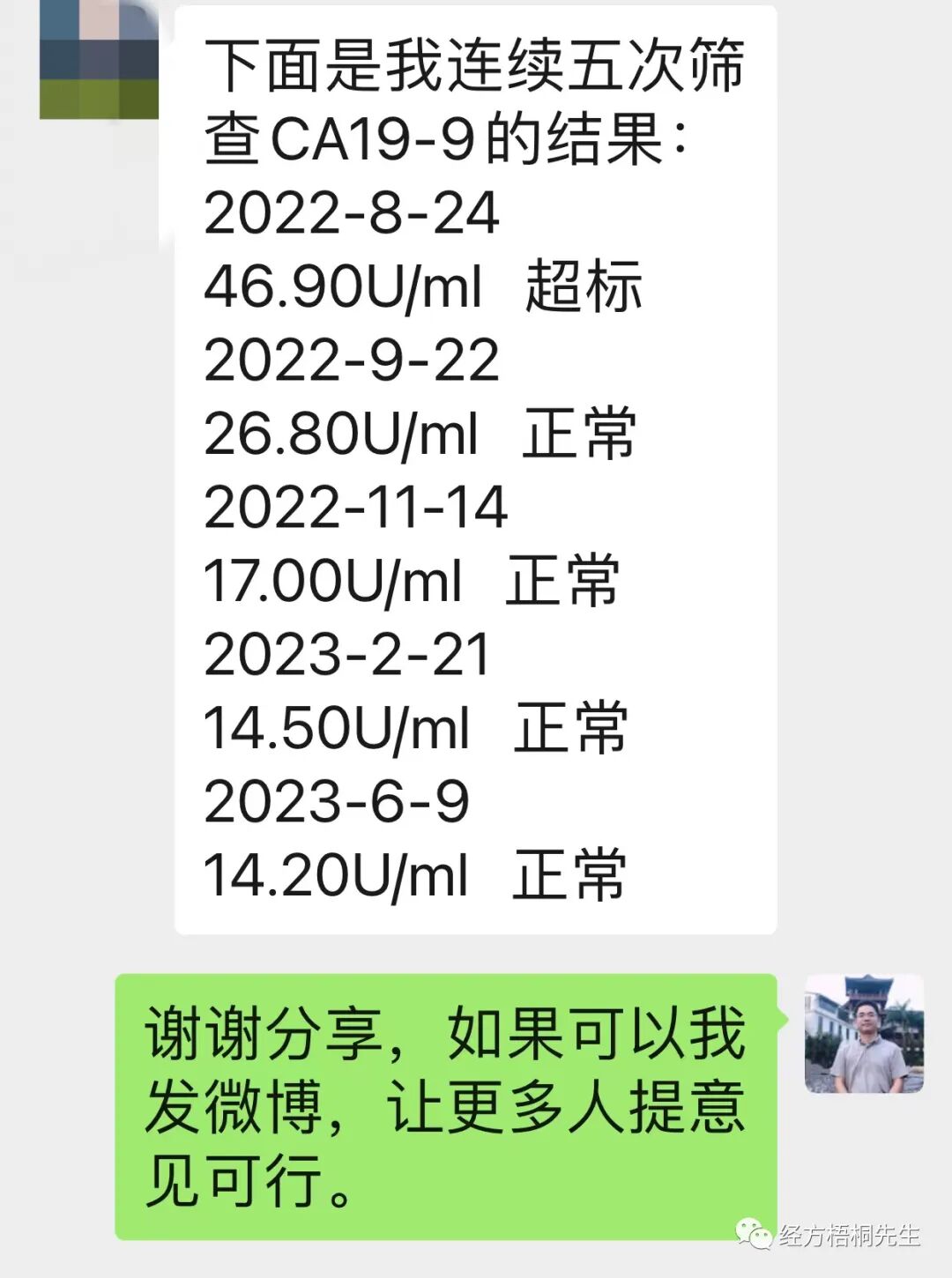 不好意思,一个学发动机的老头对重大医学问题说了很多外行话,让您见笑了。希望这个信息对您有帮助。谢谢!下面是我连续五次筛查CA19-9的结果:2022-8-24 46.90U/ml 超标2022-9-22 26.80U/ml 正常2022-11-14 17.00U/ml 正常2023-2-21 14.50U/ml 正常2023-6-9 14.20U/ml 正常