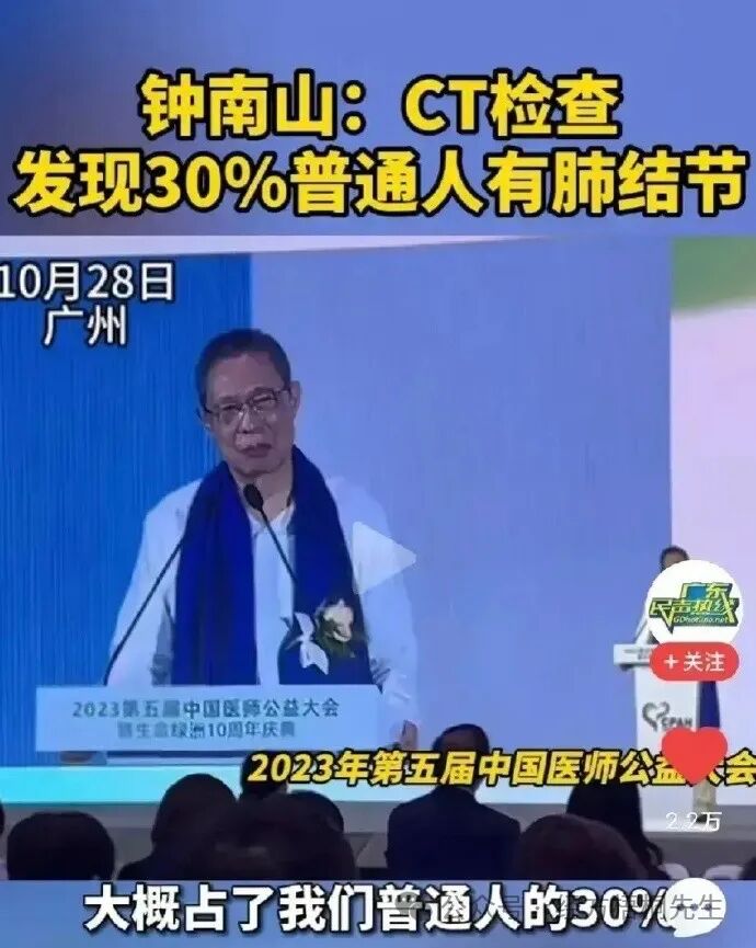在2023年第五届中国医师公益大会上,钟南山表示,CT检查发现30%普通人有肺结节,恶性肺结节早干预就像割脓包 。