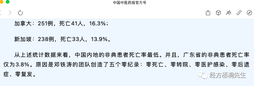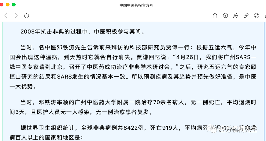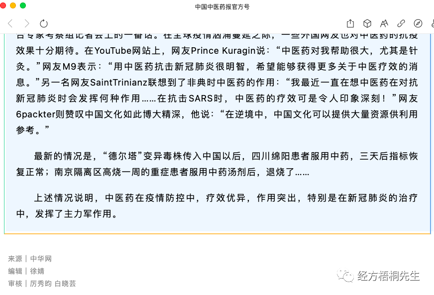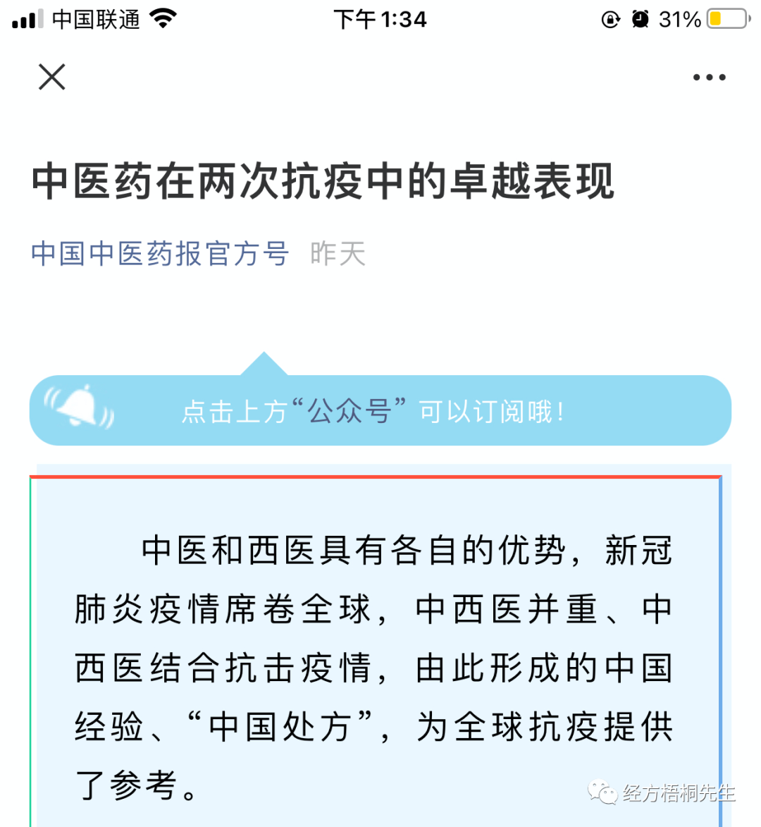 听说中国中医药报公众号也转发了林治波的雄文《中医药在两次抗疫中的卓越表现》,欣喜万分,但是打开一看,却让人大失所望,雄文被骟成软文,中国中医药报动手术功力非常,让人以为中国中医药报不是亲妈是后妈。