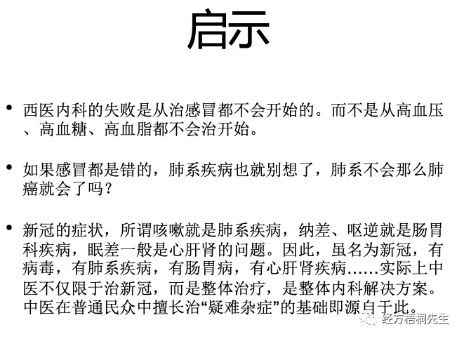 西医内科的失败,这个西医,它不光是对这个新冠不行的,它也不光是说对高血压,高血糖不行,或者是癌症不行,他对感冒一开始就不行,我们中医治感冒,真是快。