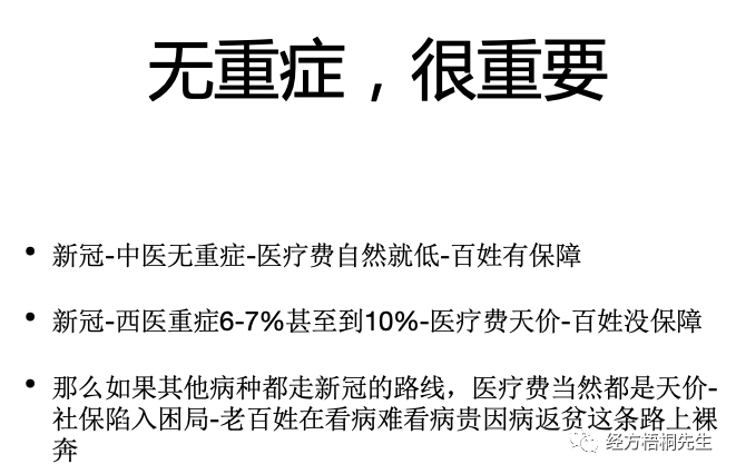 背后是什么呢?如果说所有的病种都能够像新冠一样,控制在轻症阶段,那中国老百姓了,就不会再因病返贫了。
