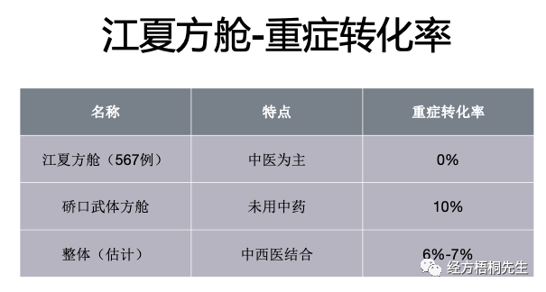 江夏方舱是没有重症。零重症转化率;硚口武体,10%,它是没有用中药的方舱;整体预估大概在6%到7%。我一直讲,武汉新冠就是遭遇战,西医用他的拿手绝活,我们中医也用我们拿手的绝活。出来的结果,就是这个。