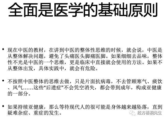 全面或是整体,我觉得不光是说我们怎么看待一个人体,应该是我们的治症的法则法规。如果我们忽略的这个就一定会有问题。