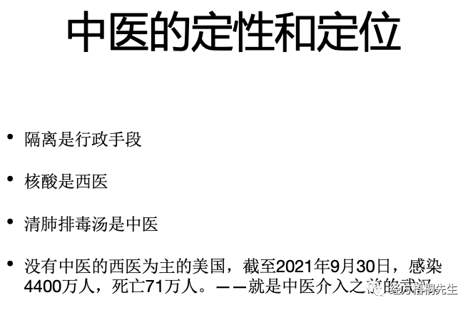 大概在2021年10月底全球的感染人数2.45亿,死亡是500万,中国是没什么大的问题。就这样的情况下,从媒体到地方,很少人会说,中医为主战胜了新冠,保卫了国家和人民生命安全。