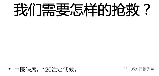假设我们的亲人今天就倒地了,假设我今天就要打个电话叫120来。结果上的全是西医的东西,但问题是,重症30%的人没有用中药就死掉了对吧?