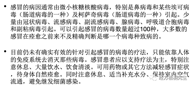 我们注意里面的一些措辞好,目前对于感冒的治疗没有很好的抗病毒药物,都是一些缓解症状的药物。感冒的恢复靠的是机体的免疫功能,所以坚持锻炼,提高免疫力。