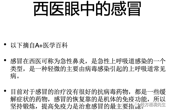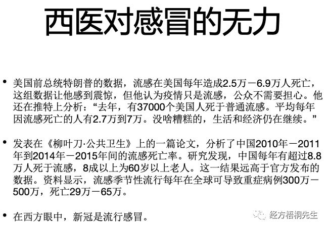 回过头来讲,刚才讲的流量入口的问题,本身新冠就是感冒。那我们就把感冒作为一个流量入口拿下,那我们子子孙孙或者是我们未来的中国人都有中医中药可以用。现在的情况就是从第一步治感冒开始,不光西医有问题,中医一样就是有问题的。