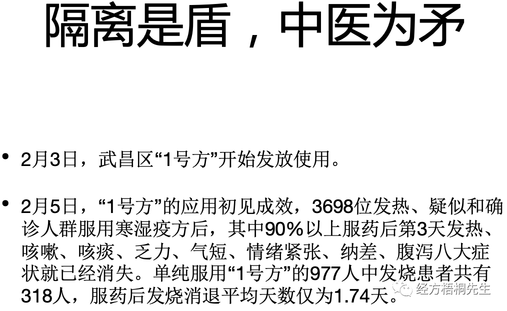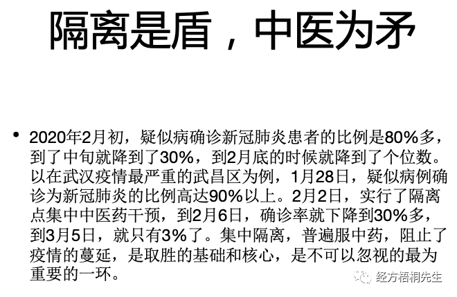 现在很多人都说这个隔离是让我们整个中国人充满安全感的一个手段,而不是中医。我说,像国外早期他也想隔离,但问题隔离不了,隔离了之后一传十,十传百,他没有一个药能够大规模把这个病给扑灭。