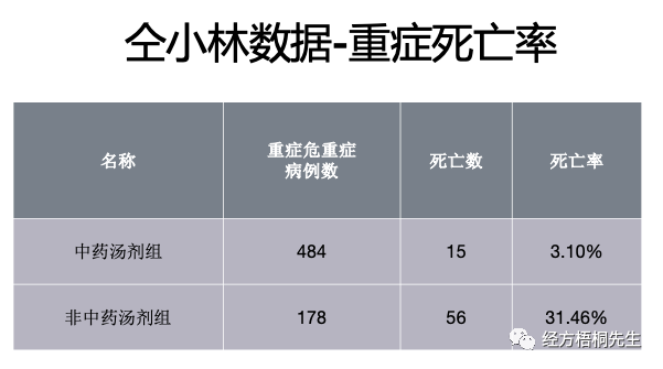 那么,这又是一个数据,来自仝小林发表的这个论文。这个数据也假不了,国家媒体报道的。中药汤剂组484例,死亡15例,死亡率3.1%。非中药汤组178例,死亡数56,死亡率31.46%。