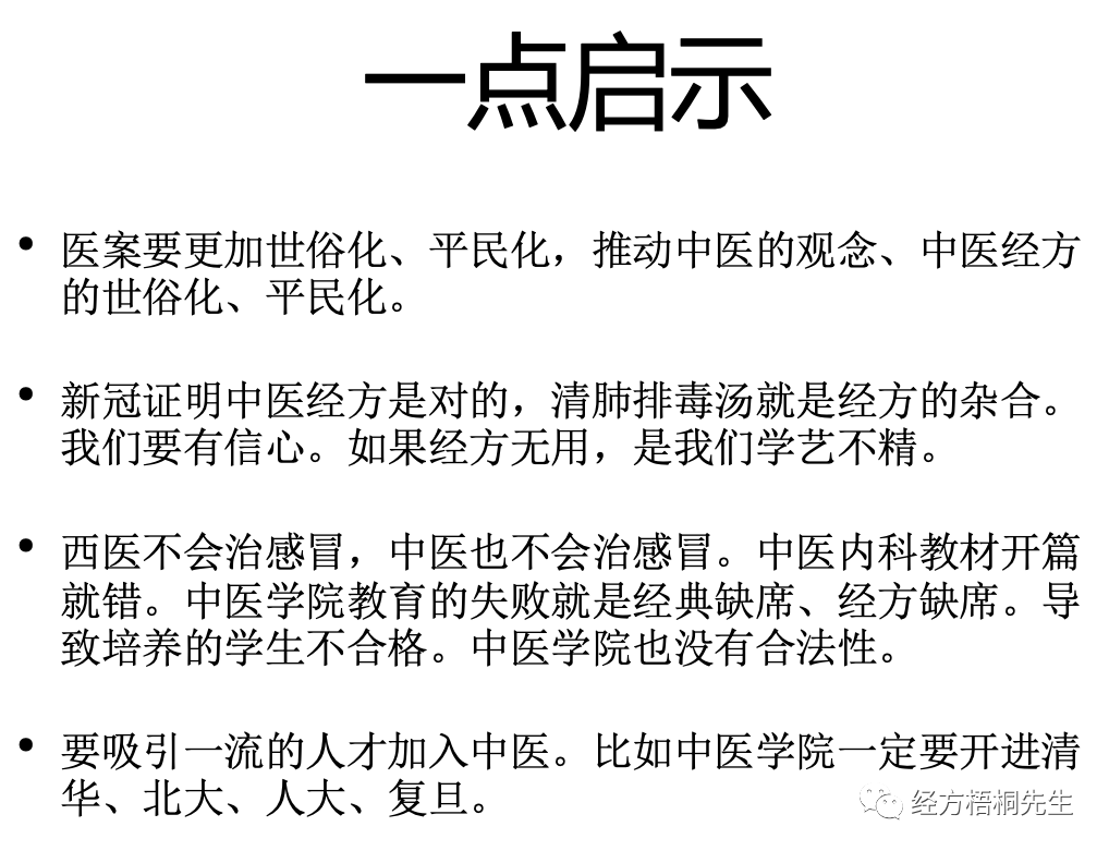 第二个,新冠证明我们中医经方是对的,清肺排毒汤的治愈效果也非常的好。如果经方无用肯定是我们学习不得法。这里面还有另一个问题,就是我们的教材一定有问题。教出来的孩子的连感冒都不会治,内科教材什么风寒、风热,我用的一直都是麻黄汤、桂枝汤。那日本的汉方也是麻黄桂枝,效果非常的好。