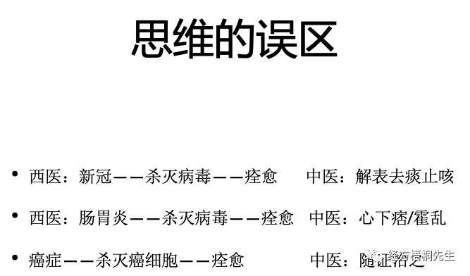 西医他没有这种六经辨证的观念,我今天为什么说中医的科学观念很重要。西学中学什么?学我们中医的观念,把六经辨证先学回去,把我们将疾病控制、剿灭在轻症阶段的超能力学回去。