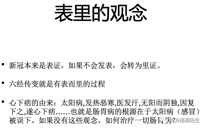 这个我觉得也讲得比较清楚了,包括心下痞,我现在就讲肠胃病的由来。这是伤寒里面的原话,太阳病,发热恶寒,医发汗,无阳而阴独,因复下之,遂心下痞……我们用的是几个泻心汤。那如果没有这观念,我不知道他们怎么治乱了。