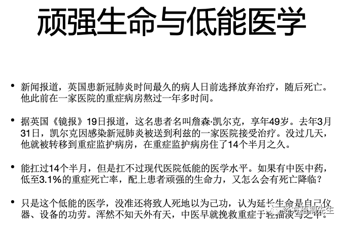 我们不要局限于说这病就是一个新冠,那样对中医不公平,其实很多疾病是掩盖在背面的。我说这是内科的胜利,这个待会儿我还会继续讲。
