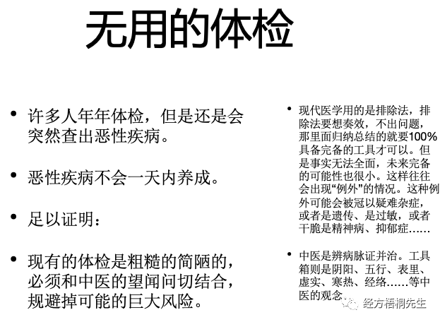 西医体检用的是排除法,并且他的工具箱包里面缺乏了太多太多,本来应该包容的东西,导致体检一样错漏百出。