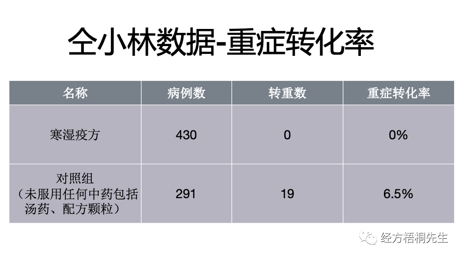 这是仝小林在武昌的数据,寒湿疫方,430例,重症转化率0%,对照组没有用任何的中药,包括配方颗粒,291例,转重6.5%,就是有这样的一个区别。