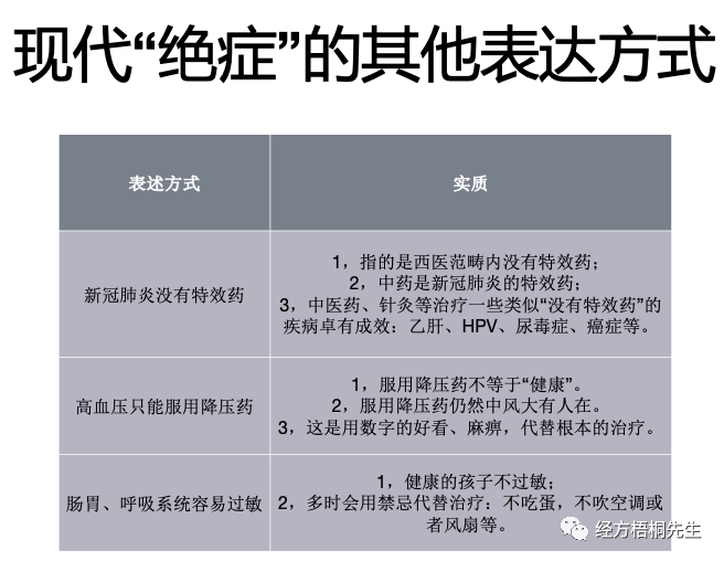 我还归纳了一下这个现代绝症的其他表述方式。当你感冒说我只能控制不能治愈的时候,你就告诉我这就是绝症。当你说新冠没有特效药的时候,其实你就告诉我,这个情况是绝症。如果我们大胆设想一下,如果我们中医不会治新冠。毫无疑问,这又是会对它宣称为绝症的一种疾病。国内不敢讲了,国外敢讲。前阵子张涵予主演的《中国医生》敢讲,“这病没药治”。