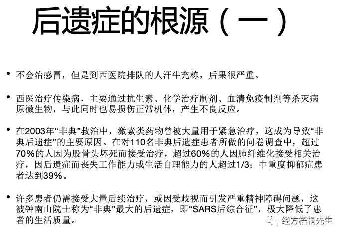 当不会治又要乱治的时候,激素上去,化学药又狠毒,非典最典型的就非典后遗症,现在新冠后遗症一样的,但中国会好很多,中国有中医。出现后遗症这是第一种,就是当他不会治,非要去治乱,用的一些药,我们也不知道怎么去判断他们的药性的时候,问题就来了。