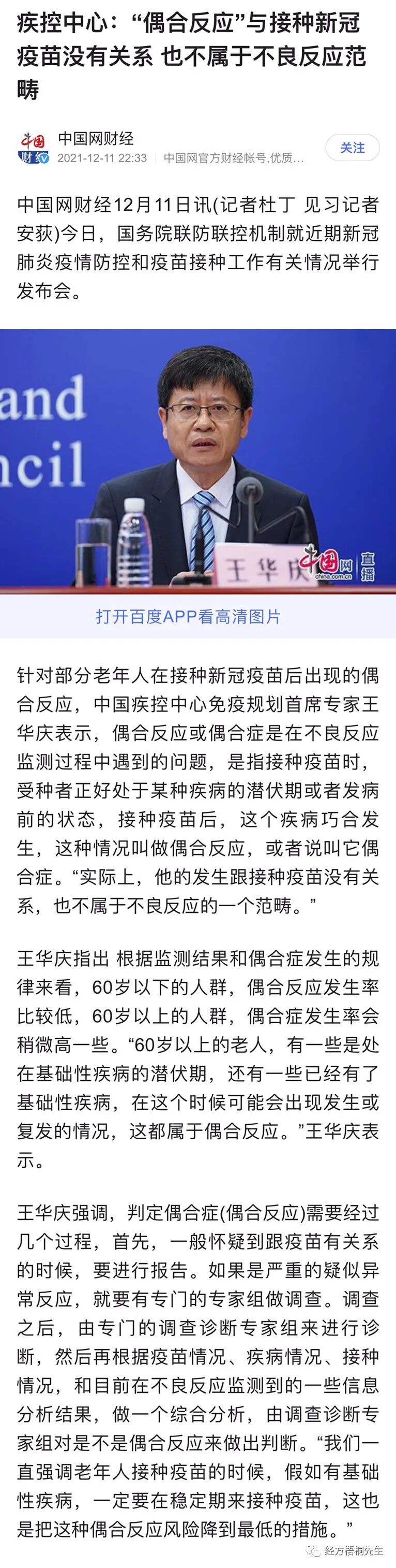 2,疾控中心既然也承认有“部分老年人在接种新冠疫苗后出现的偶合反”,是偶合还是因果,请利益不相关的机构做评估,这也是自证清白的一个机会,让公众放心。