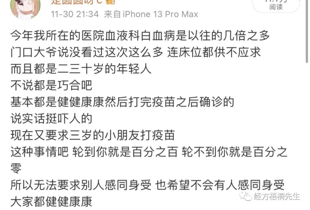 这就是一个患者的观感,类似的感受还不少,那就是白血病增多。这个数据只是直观的,背后的医疗机构的数据有没有?我建议媒体、记者要去调出相关的数据来,安抚社会大众。并且,专业点,不要人云亦云,要符合常识。比如也可能这些患者还有其它同样的行为,不一定跟打疫苗并行的行为,可能之前没被关注到。也可能这个人的直观感受干脆就是假的。