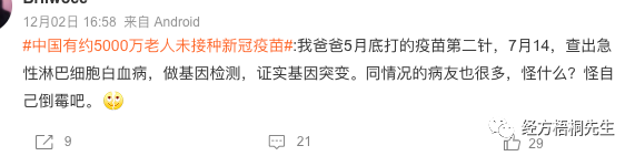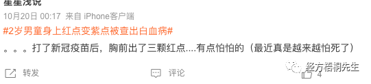 也有讲自己家里人先是打了新冠,然后得了白血病(这是时间顺序,并没有因果)。有无因果关系,必须是权威的、第三方的,无利益关系的机构给出比较稳妥。