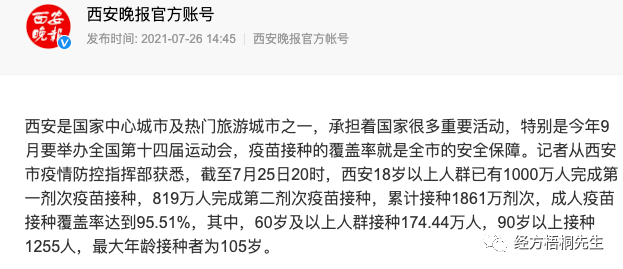 根据相关媒体报道,早在今年7月底,西安成人接种率已经达到95%,超过1000万人接种。