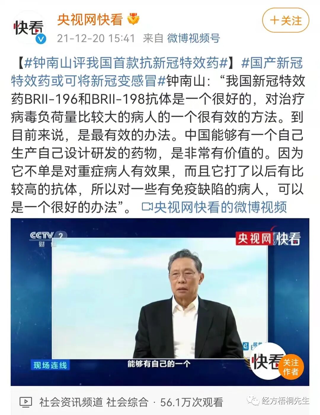 那边,钟南山院士力挺“新冠特效药”的发声还在流传:“一个很好的”、“很有效的方法”、“最有效的方法”、“非常有价值”……