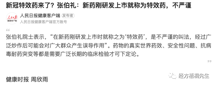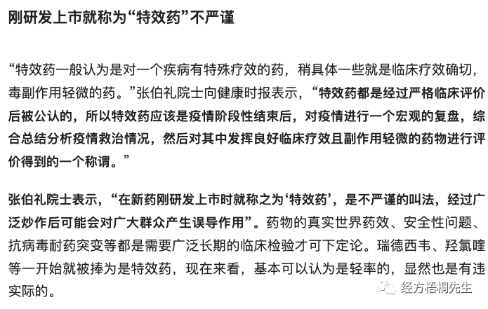 首先,我之前在《新冠特效药果然如钟南山所力挺那么神效吗?》和《新冠特效即将面世,中医是否又要被遗忘?》都表达了对特效药的担心,这一点上,我是赞同张伯礼院士立场和观点的。