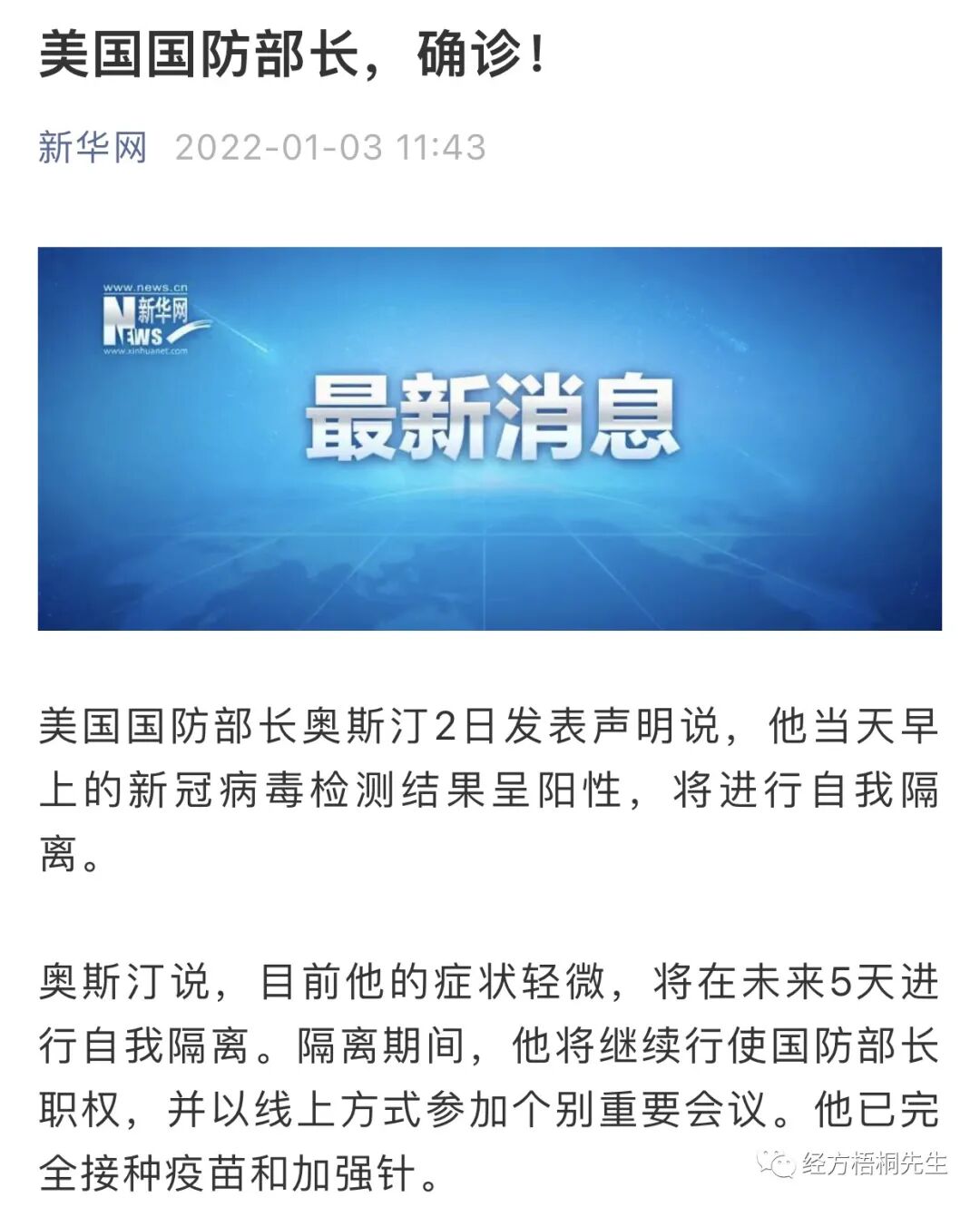 奥斯汀说,他最近一次与总统拜登会面是在2021年12月21日,那时的检测结果呈阴性。