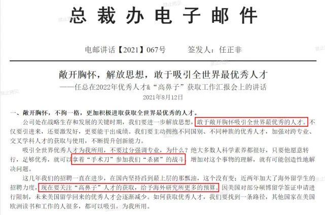 “要吸引‘高鼻子’来中国工作,参加‘杀猪’战斗”,任正非在讲话中强调,在华为战略生存和发展的关键时期,要吸引全世界优秀人才为我所用。