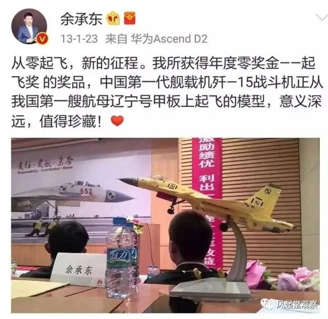 但终究是没有完成6000万部手机的指标,余承东自请零奖金,任正非给他颁发了一个特别的奖项——“从零起飞奖”,一架歼-15战斗机模型。